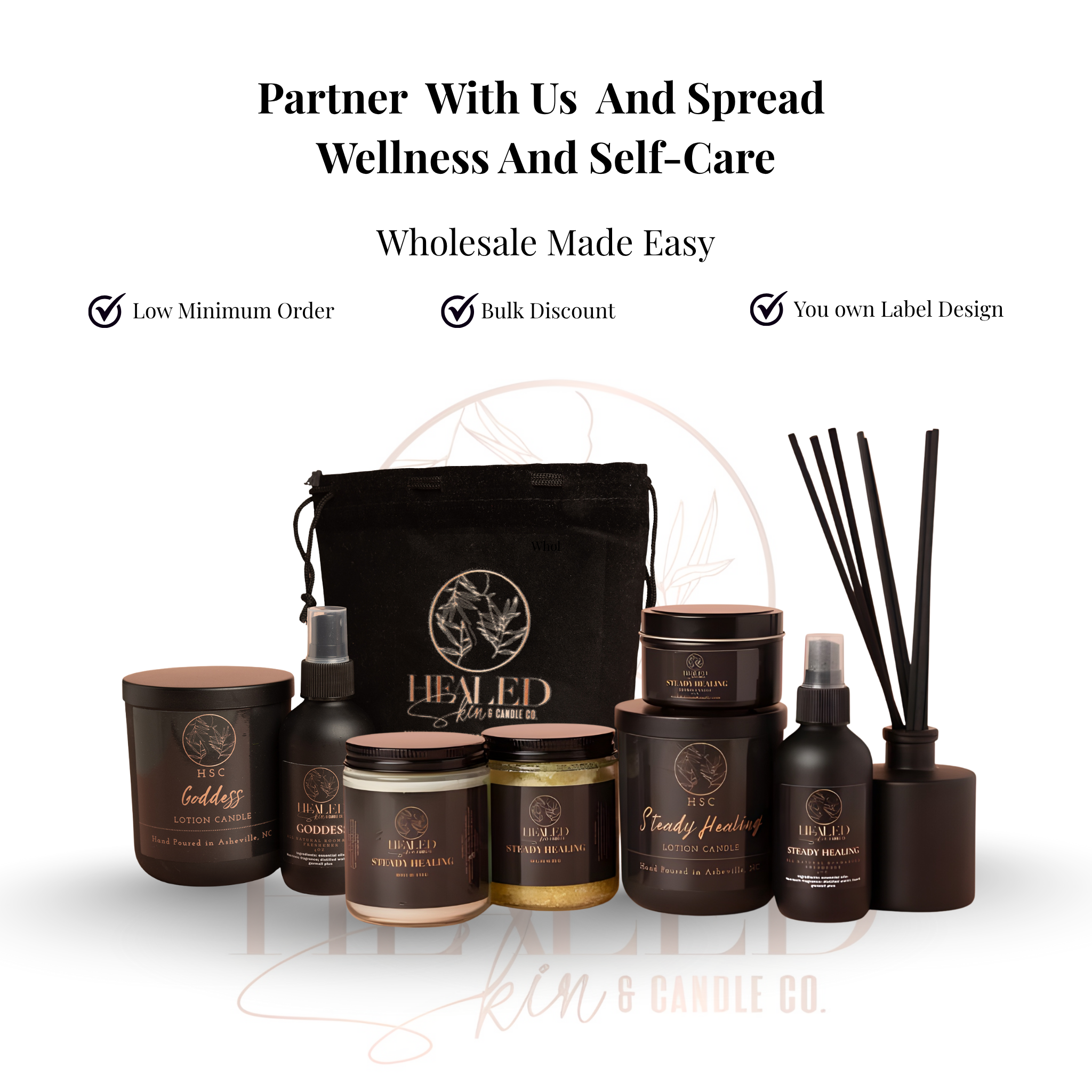 Dreaming of launching your own candle or skincare line? We’re here to make it easy, seamless, and beautifully done. With Healed Skin & Candle Co., you don’t just become a wholesale partner — you gain the opportunity to build your own brand using our luxurious, plant-based products crafted with intention and care.
